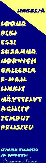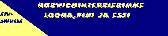 Tervehdys kaikille surffareille ja tervetuloa kotisivuilleni! N�ilt� sivuilta l�yd�t tietoa koiristamme Loonasta, Pikist� j� Essist�. Siirry eteenp�in klikkaamalla linkkej� sivun vasemmassa reunassa.